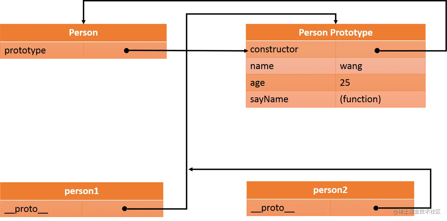上面的代码中,新建了一个Person对象,然后在Person的原型对象上(Person.prototype)添加了属性和方法,Person的原型对象有个constructor属性,指向Person。通过new Person()创建了两个实例对象person1和person2,person1的__proto__指向的就是Person的原型对象。下图表明了上述关系。