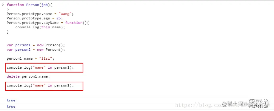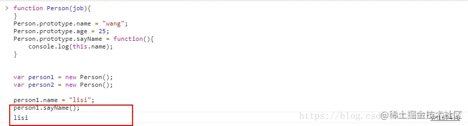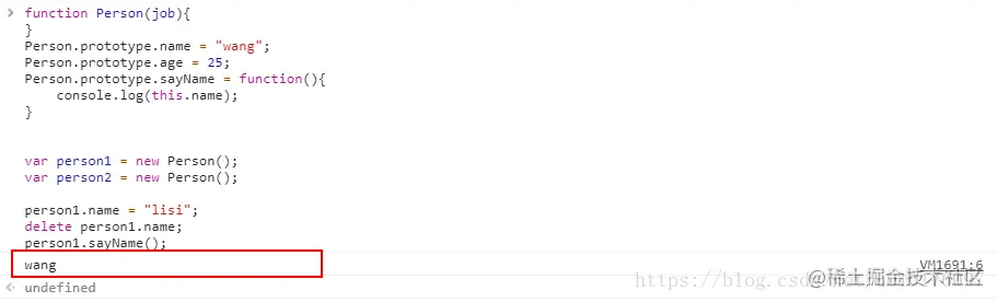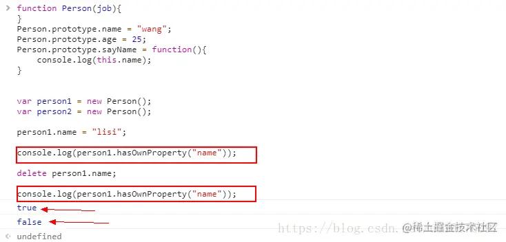 在上面的代码中,person1中也有个name属性,在调用sayName方法时,会先在实例对象中查找name,如果有,返回name,如果没有,则继续在原型对象中查找,依次向上,直到找到或者没找到返回null。虽然可以通过对象实例访问原型对象中的值,但是却不能通过实例对象重写原型中的值。如果在实例对象中已经找到了name属性,则自动屏蔽掉原型对象中的值。不过,通过delete操作符可以删除实例属性。