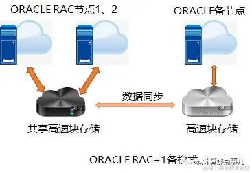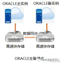 将Oracle部署在虚拟机上,挂载高速块存储,作为主实例,同时再部署一套相同的虚拟机和块存储,作为备实例,两者之间通过ORACLE同步软件同步数据,如下图所示: