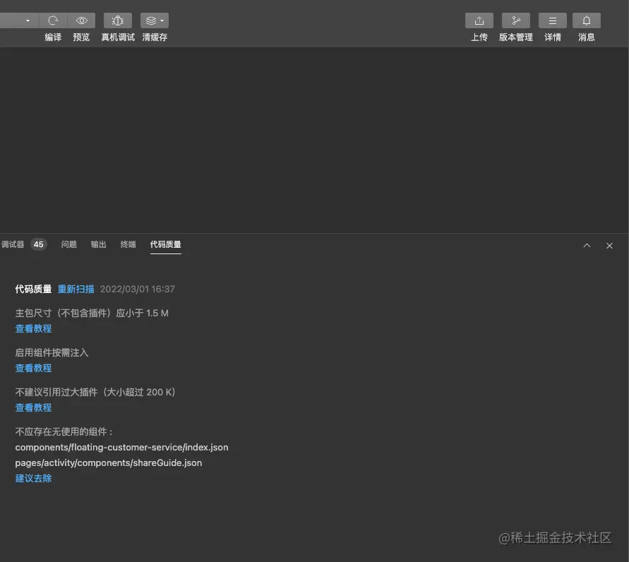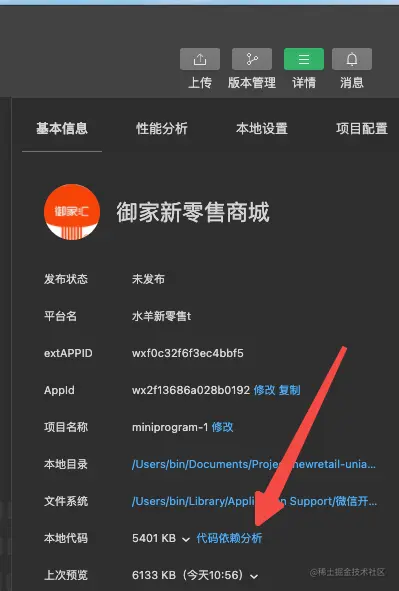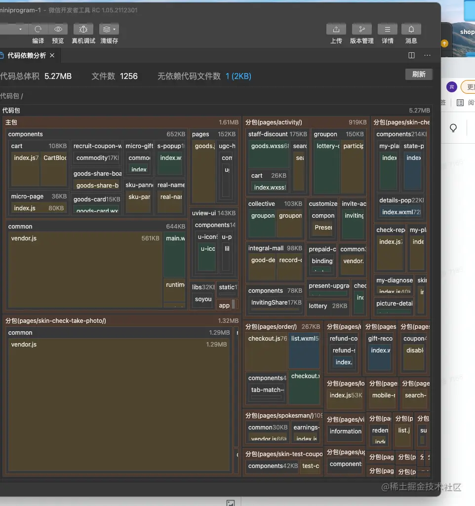 可以使用原生小程序开发者工具自带的分析工具(或者webpack-bundle-analyzer插件),它可以直观分析打包出的文件包含哪些,大小占比如何,模块包含关系,依赖项,文件是否重复,压缩后大小如何,我们可以做针对性优化。