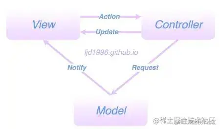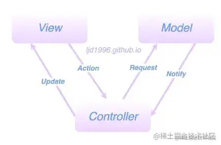 该架构涉及三个角色: Model-View-Controller。其中 Controller 是 Model 与 View 之间的桥梁,用来控制程序的流程。