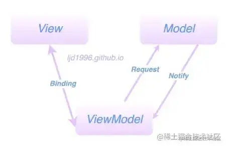 它跟 MVP 看起来也是比较类似的,不同之处在于 Presenter 换成了 ViewModel, ViewModel 负责与 Model 层交互,并且将数据以可观察对象的形式提供给 View, ViewModel 与 View 层分离,即 ViewModel 不应该知道与之交互的 View 是什么。