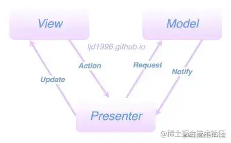 其交互流程依旧是:用户操作 View 层,产生了一个事件; Presenter 接收事件,并对其作出反应,请求 Model 层; Model 层作出处理后通知给 Presenter, Presenter 进而再通知到 View 层。