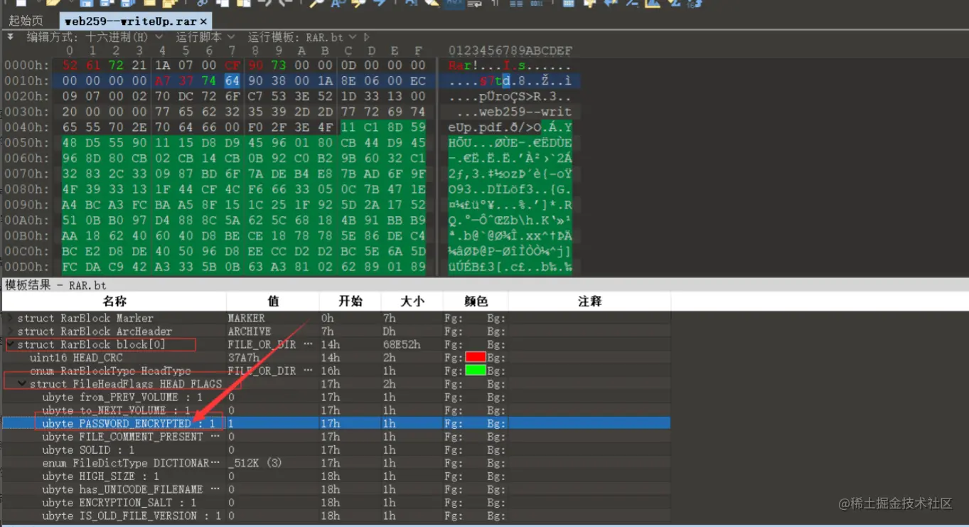 rar4的伪加密方法为,将箭头所指的名称的值改为1即可