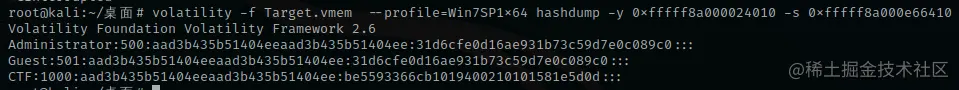 volatility -f Target.vmem --profile=Win7SP1x64 hashdump -y 0xfffff8a000024010 -s 0xfffff8a000e66410