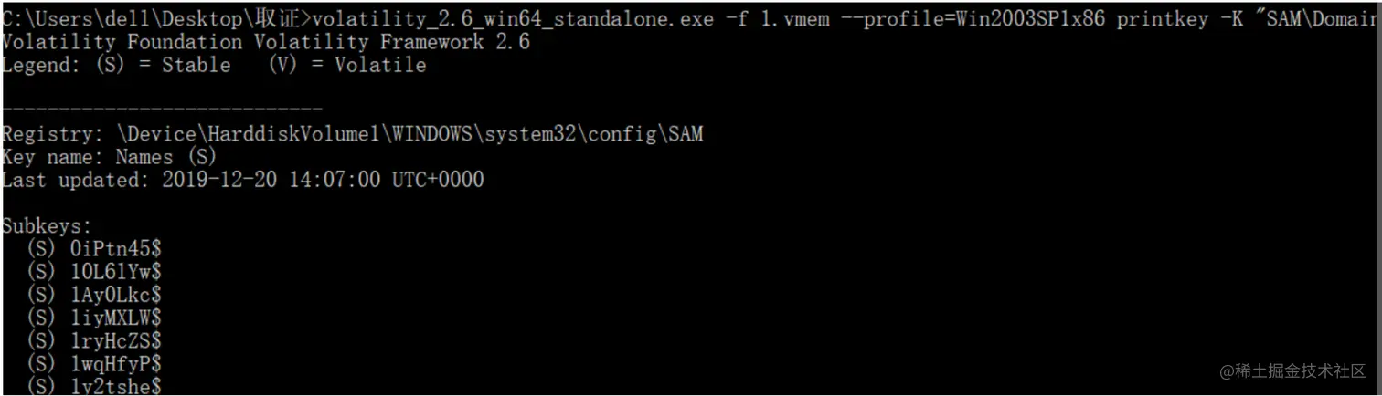 volatility_2.6_win64_standalone.exe -f 1.vmem --profile=Win2003SP1x86 printkey -K "SAM\Domains\Account\Users\Names"