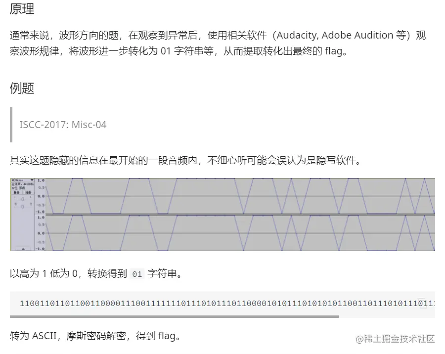 常见隐写方式 :频谱图信息涂抹(audacity查看) 、音频藏Morse码 、MP3stego