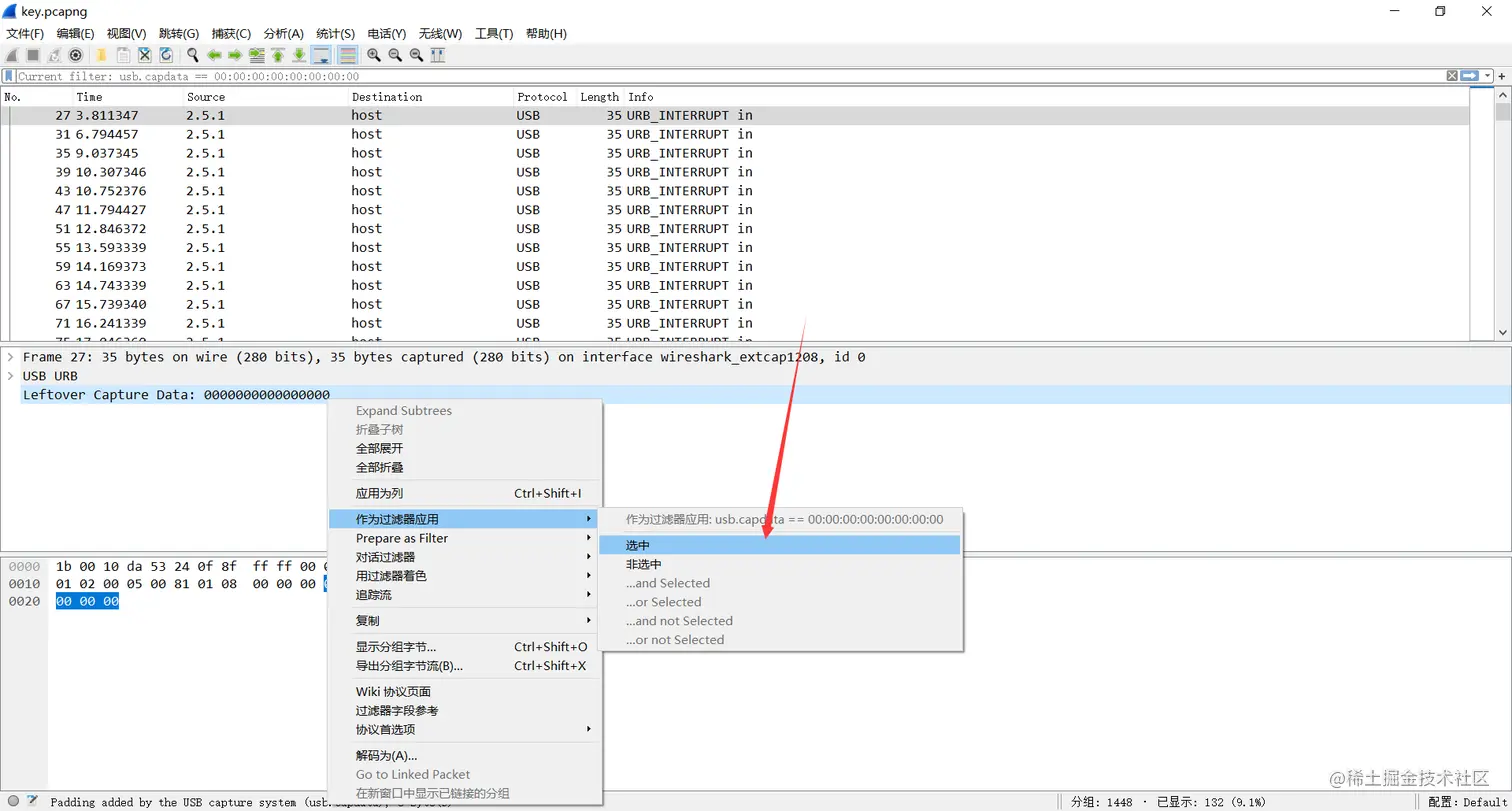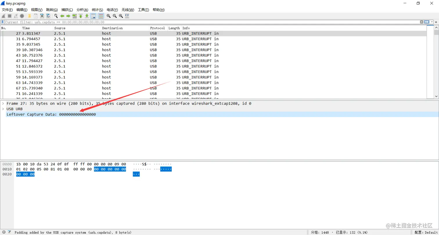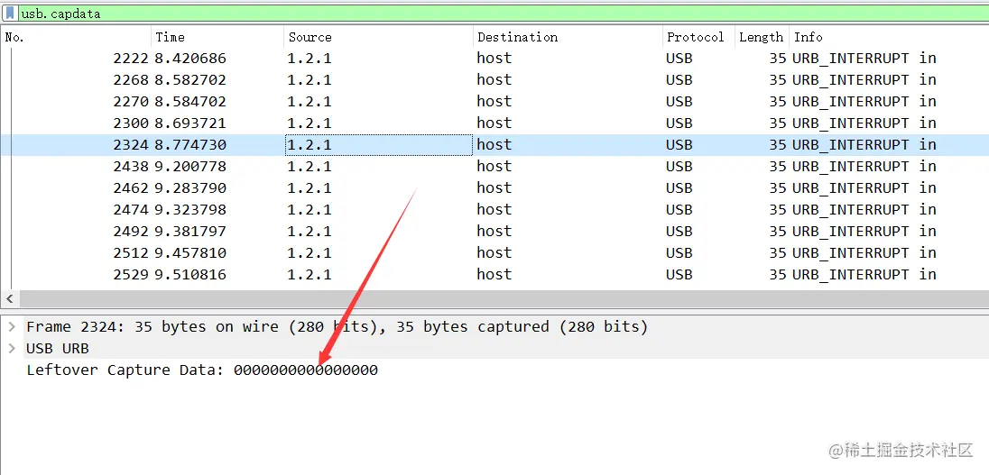所以我们要提取每个数据包的内容就位 usb.capdata