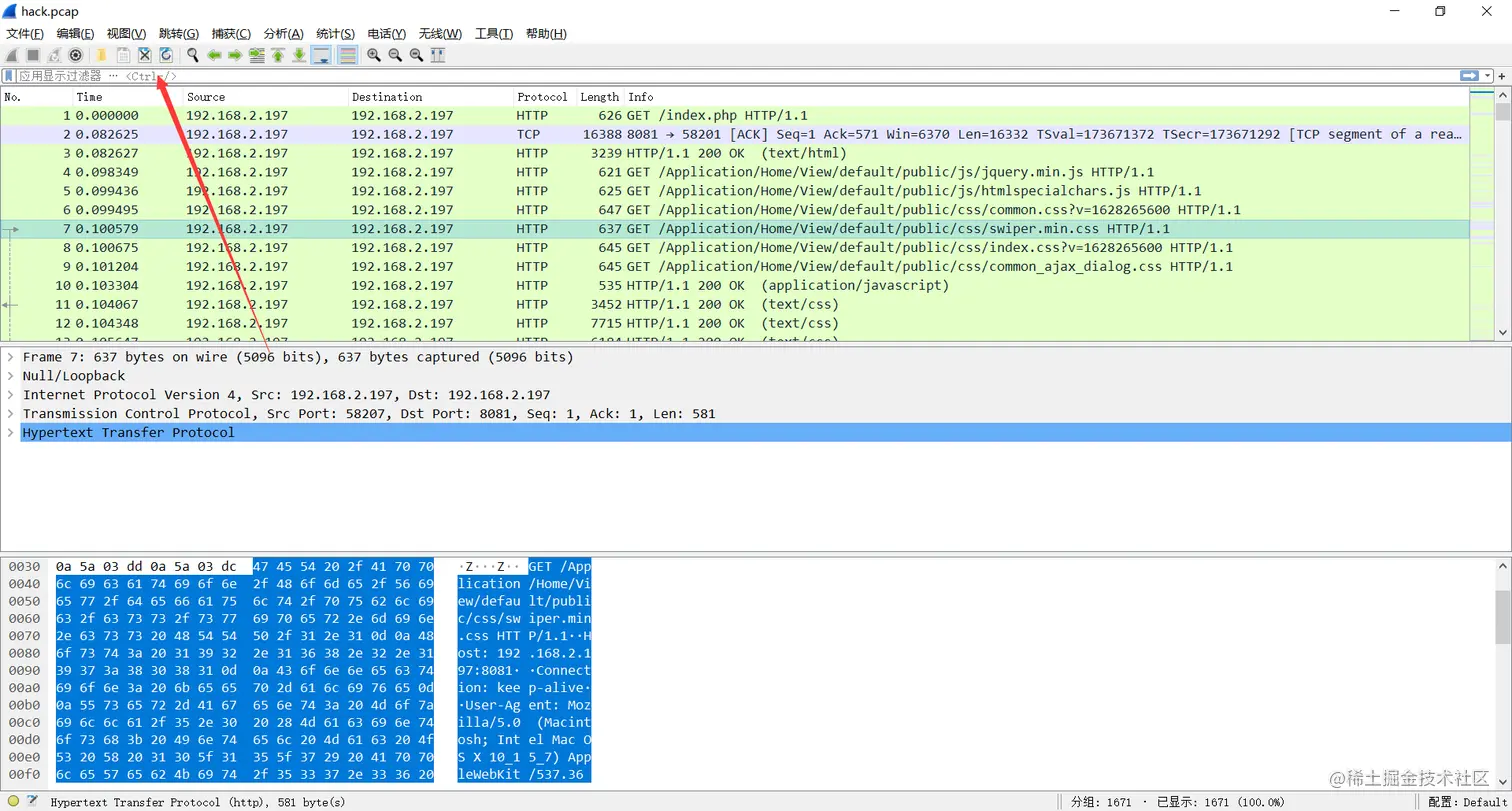 左上角的应用过滤器,可以直接在上面输入想要过滤的内容,比如只想看http的包,那么直接输入http