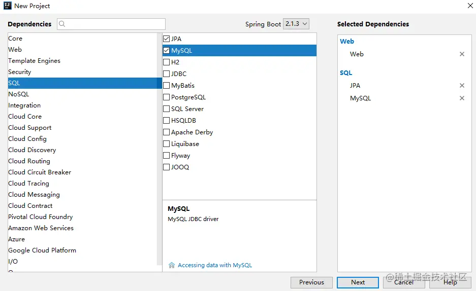 创建Spring Boot工程,添加Web、Jpa以及MySQL驱动依赖,如下: