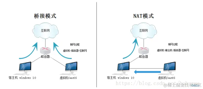 桥接与NAT模式访问互联网过程,如下图所示