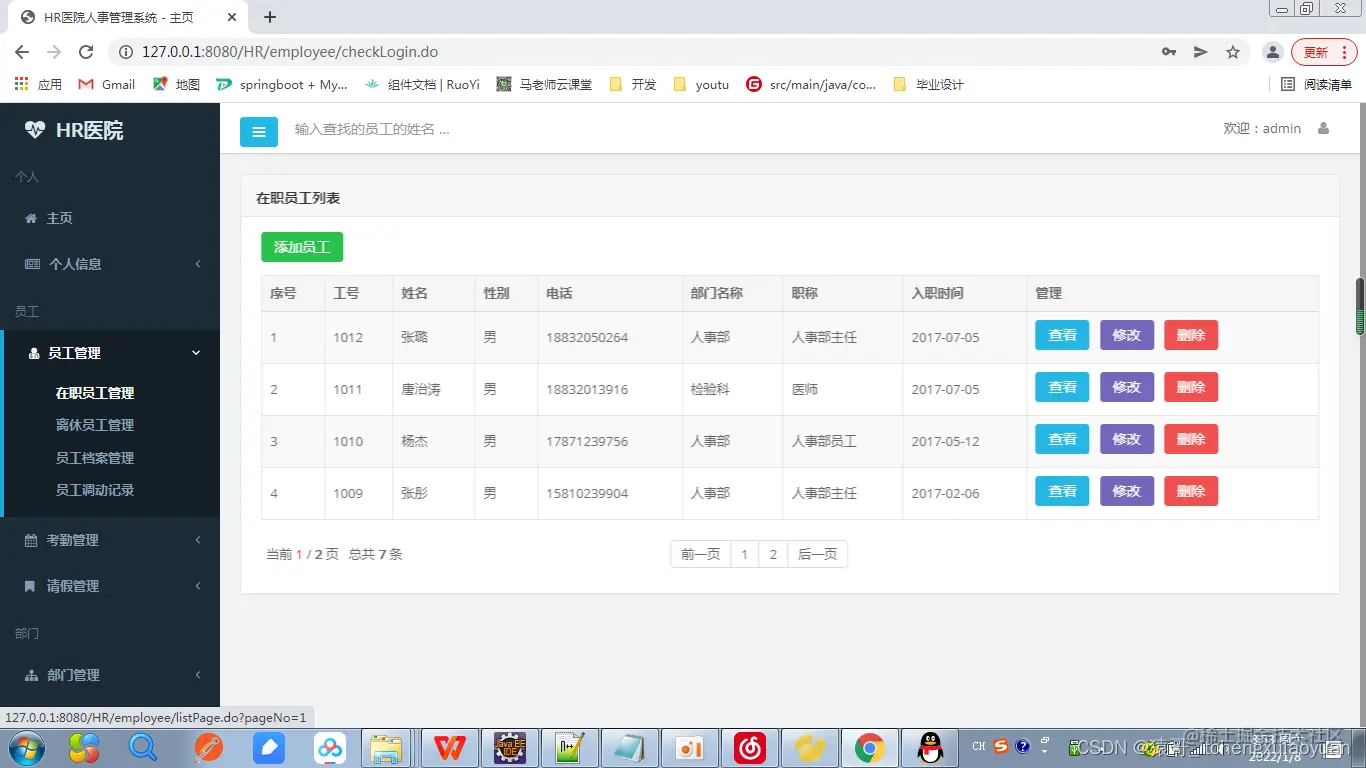 基于ssm开发的医院人事管理系统 it程序老猿 2022-04-02 179 阅读1分钟 本文已参与「新人创作礼」活动,一起开启掘金创作之路。 项目功能: 基于ssm开发的医院人事管理系统 主要包含员工,考勤,请假 系统管理几大模块 员工管理: 在职员工管理 离职员工管理 退休员工管理 考勤管理:考勤管理 加班管理 请假管理:请假管理 请假审核 技术 spring+spring mvc+mybatis+bootstrap+jquery+jsp+shiro jdk7+tomcat7+mysql+MyEclipse+maven 页面效果 \