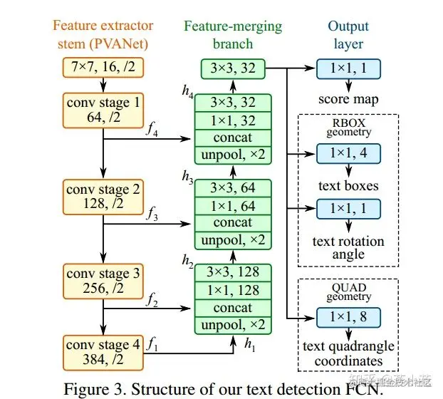 - 网络输出层,包含文本得分和文本形状.根据不同文本形状(可分为RBOX和QUAD),输出也各不相同,具体参看网络结构图