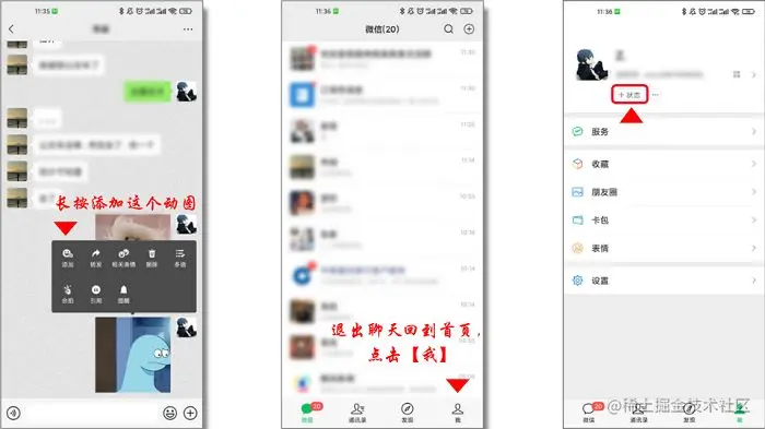 步骤2.将发送的动态表情或图片长按“添加”,随后退出聊天窗口后点击【我】,来到微信的个人中心,选择头像下方的“+状态”;
