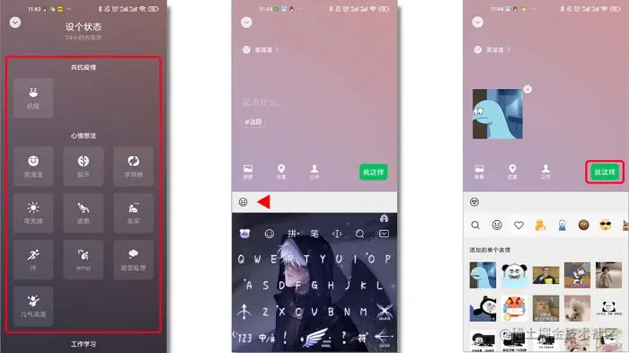 步骤3.在此处选择自己心仪的状态后,可以看到有个表情图标,跟我们平时聊天的时候要发送表情包的那个图标设置一样的,我们点击它,然后选择你添加好的,或者其他已有的动态表情或图片后,选择“就这样”即可设置完成!