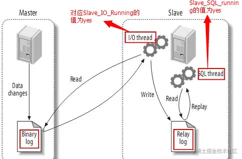 上图中有两个服务器, 演示了从一个主服务器(master) 把数据同步到从服务器(slave)的过程。