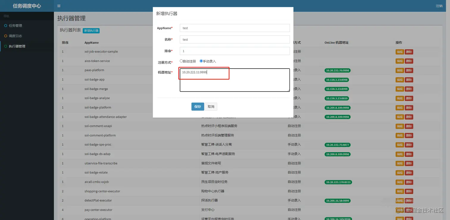 5、注册中心: 执行器会周期性自动注册任务, 调度中心将会自动发现注册的任务并触发执行。同时,也支持手动录入执行器地址;
