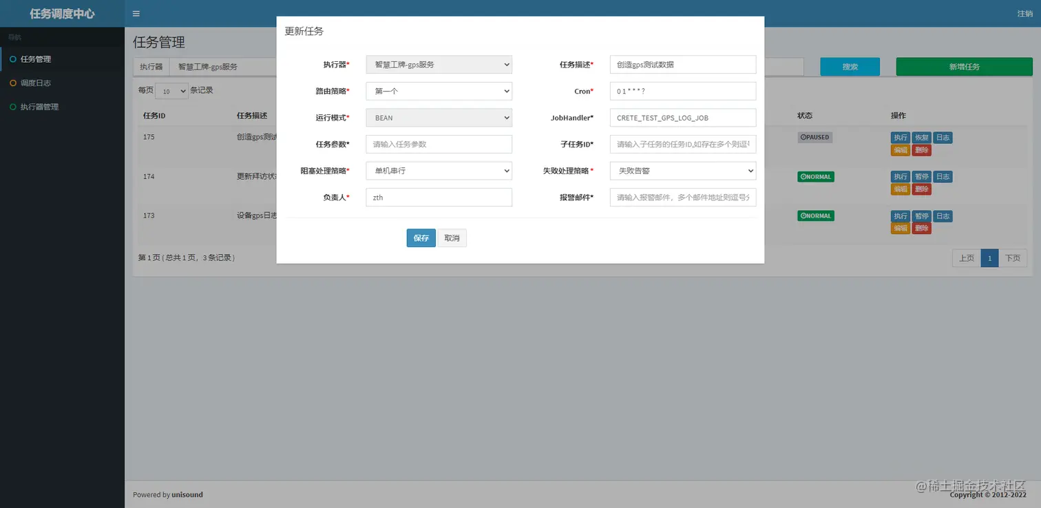 - 报警邮件:任务调度失败时邮件通知的邮箱地址,支持配置多邮箱地址,配置多个邮箱地址时用逗号分隔;