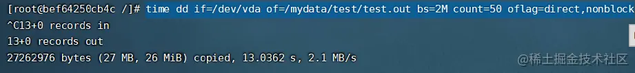 time dd if=/dev/vda of=/mydata/test/test.out bs=2M count=50 oflag=direct,nonblock