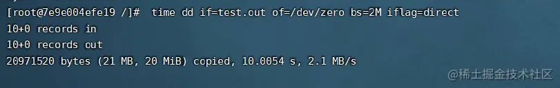 time dd if=/dev/zero of=test.out bs=2M count=10