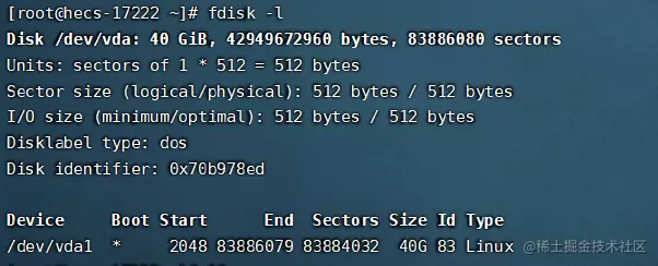 注:**/dev/vda**根据实际情况进行修改自己的硬盘(/dev/sda是在STAT、SCSI第一个接口上的硬盘),**可以根据命令查看硬盘分区**