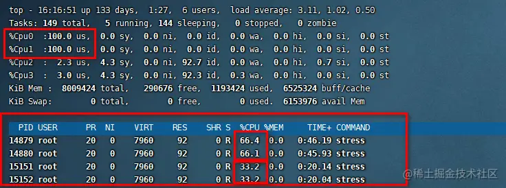 - 再打开一个终端,输入top指令,然后按1快捷键