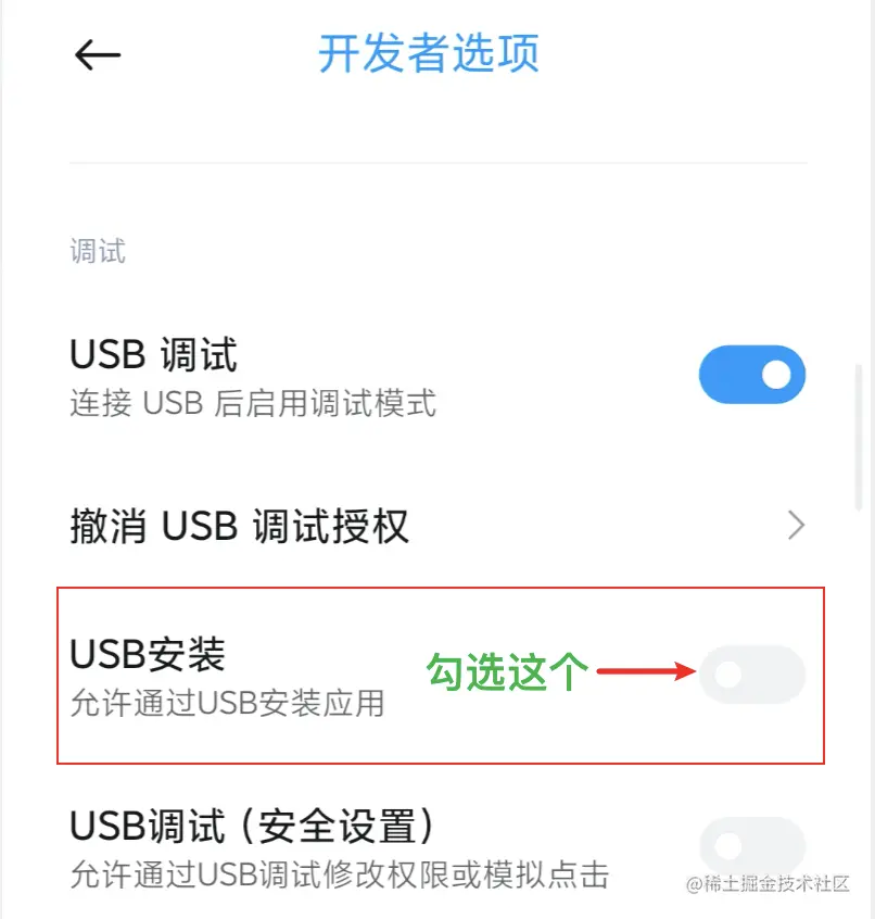 我的 Redmi Note 9 Pro 是 Android 10 版本,MIUI 版本是 12.0.2 稳定版,在「设置」-「更多设置」- 「开发者选项」中,滑动到 「USB安装」处,如下图所示