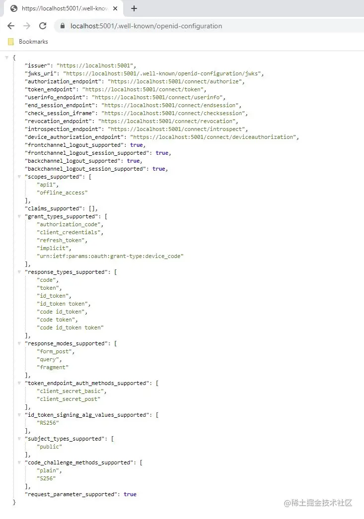 就是这样 - 如果运行服务器并浏览浏览器 http://localhost:5000/.well-known/openid-configuration,会看到所谓的发现文档。客户端和API将使用它来下载必要的配置数据。