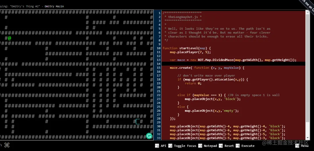 游戏为你提供了一个类似流氓的游戏环境和一个控制台窗口,其中有生成每个级别的JavaScript代码。