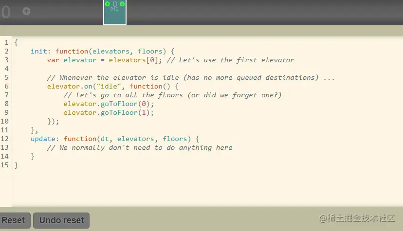 - 通知电梯到1楼:elevator.goToFloor(1)