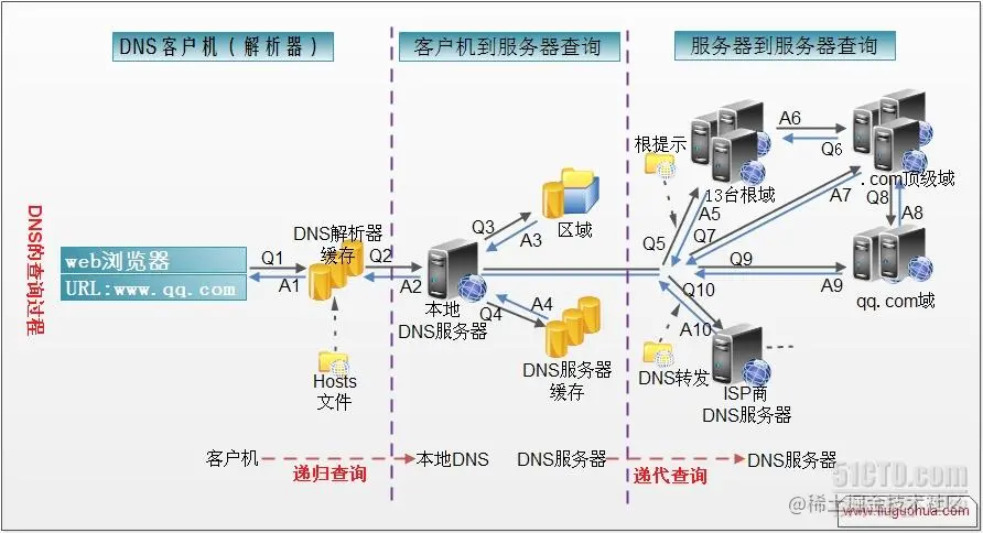 - 如果本地DNS服务器本地区域文件与缓存解析都失效,则根据本地DNS服务器的设置(是否设置转发器)进行查询,如果未用转发模式,本地DNS就把请求发至13台根DNS,根DNS服务器收到请求后会判断这个域名(.com)是谁来授权管理,并会返回一个负责该顶级域名服务器的一个IP。本地DNS服务器收到IP信息后,将会联系负责.com域的这台服务器。这台负责.com域的服务器收到请求后,如果自己无法解析,它就会找一个管理.com域的下一级DNS服务器地址(qq.com)给本地DNS服务器。当本地DNS服务器收到这个地址后,就会找qq.com域服务器,重复上面的动作,进行查询,直至找到www.qq.com主机。
