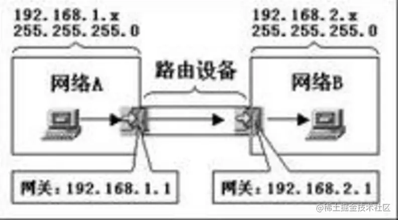 如果网络A中的主机发现数据包的目的主机不在本地网络中,就把数据包转发给它自己的网关,再由网关转发给网络B的网关,网络B的网关再转发给网络B的某个主机(如附图所示)。网络A向网络B转发数据包的过程。