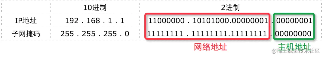 网络地址: IP 地址中被 连续的1 遮住的部分,即 11000000.10101000.00000001.00000000, 对应的网络地址:192.168.1.0