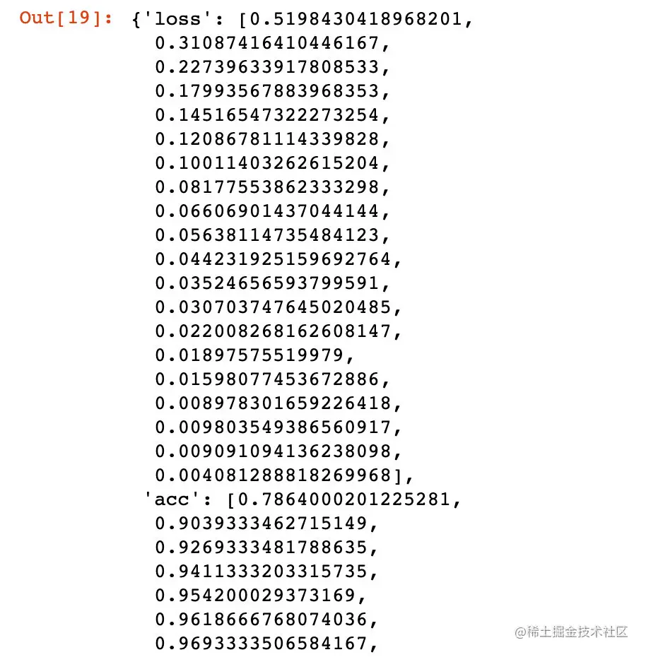 调用模型model.fit方法会返回一个history对象。这个对象有一个history成员,它是一个字典,包含训练过程中的所有数据: