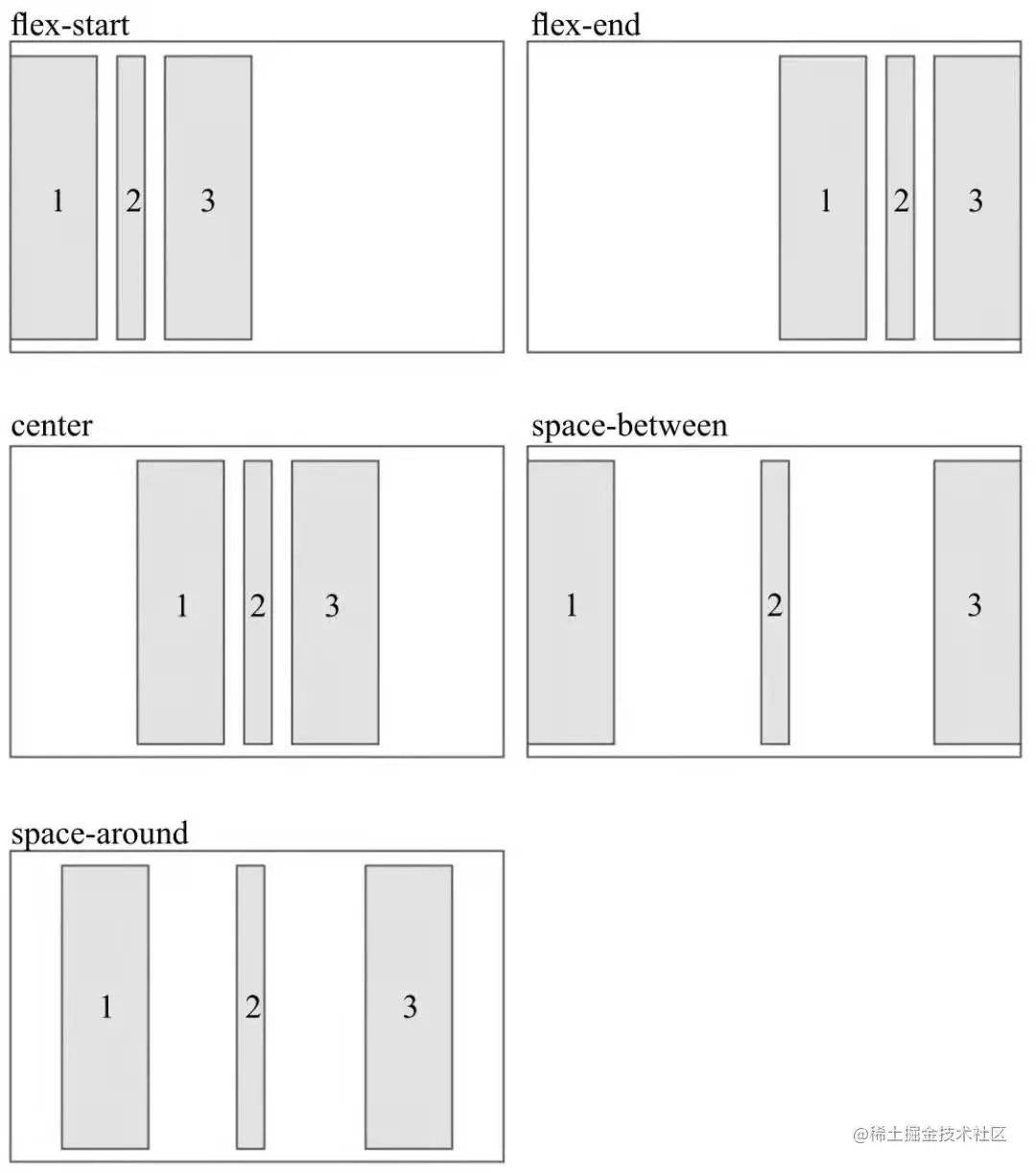 - space-around:每根轴线两侧的距离都相等,轴线之间的间隔比轴线与边框的间隔大一倍