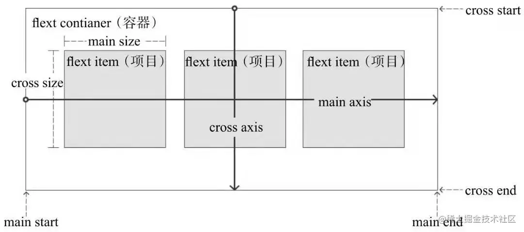 Flex布局主要由容器和项目构成,采用Flex布局的元素成为Flex元素,它所有的子元素自动成为容器成员。可以通过设置display属性为flex或inline-flex将任何一元素指定为Flex布局。如下图所示,容器默认存在两根轴,水平的主轴和垂直的交叉轴,主轴开始的地方叫main start,结束的地方叫main end;交叉轴开始的地方叫cross start,交叉轴结束的地方叫cross end,项目默认沿主轴从主轴开始的地方到主轴结束的位置进行排列,项目在主轴上占据的空间叫main size,在交叉轴上占据的空间叫cross size。