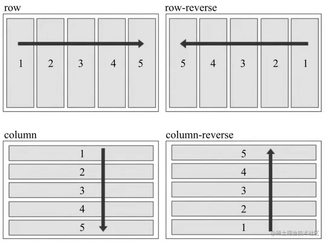 flex-direction用于指定主轴的方向,即项目排列的方向,其有四个值如下: