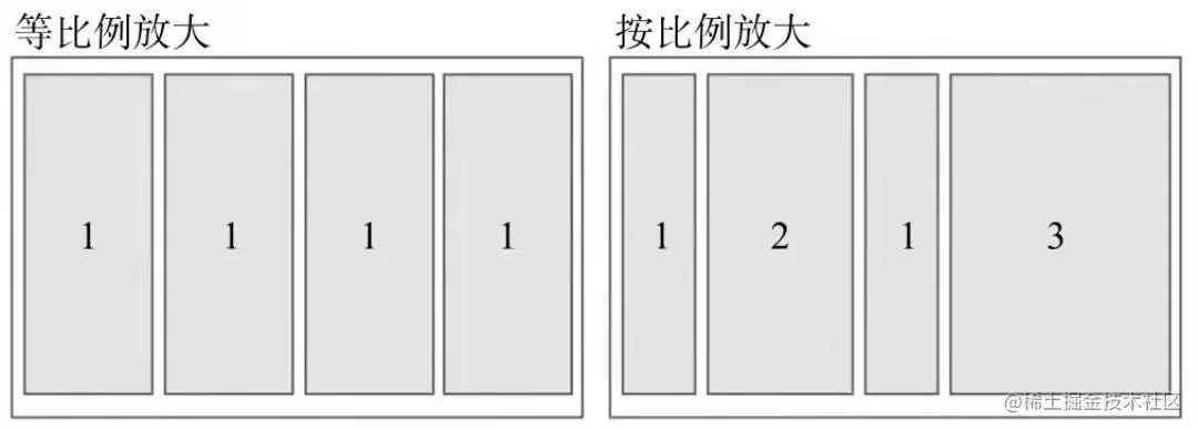 flex-grow定义项目的放大比例,默认为0,即如果存在剩余空间,也不放大,如果有剩余的空间,整体按比例填充剩余的空间。