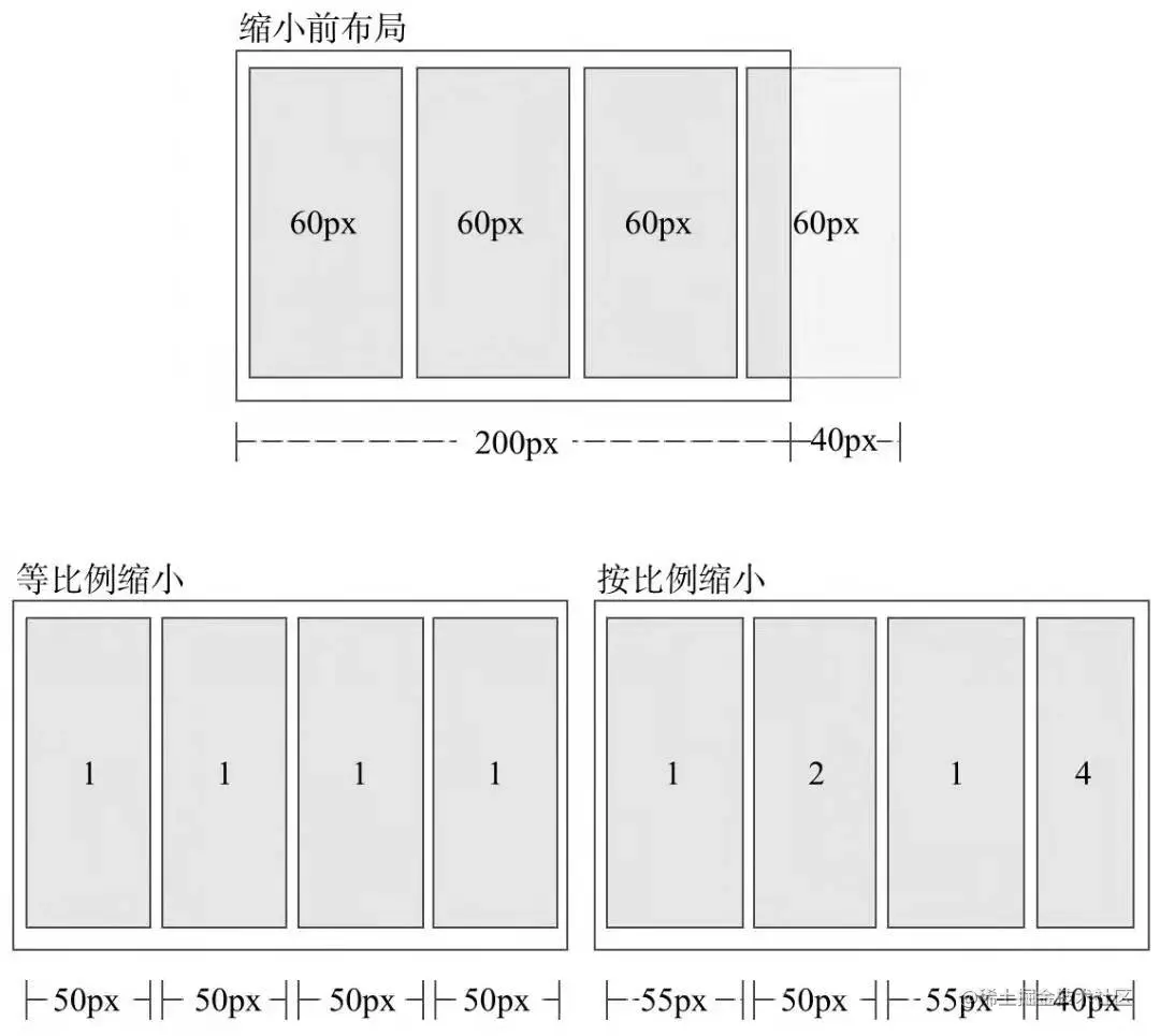 flex-shrink定义了项目的缩小比例,默认为1,如果空间不足,该项目将缩小,每个项目需要缩小的值按flex-shrink比例计算,值越大缩小的就越多。