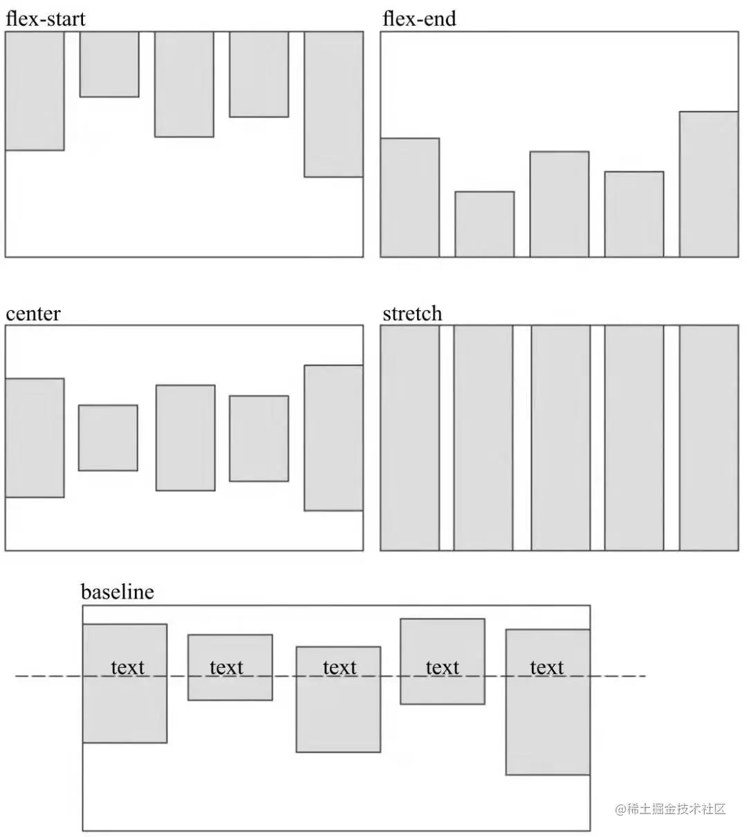 - flex-start:与交叉轴的起点对齐