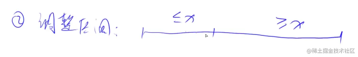 2. 调整区间(难点):以自己选取的x作为分界点,划分成两个区间,使得第一个区间的数都小于等于x,第二个区间的数都大于等于x