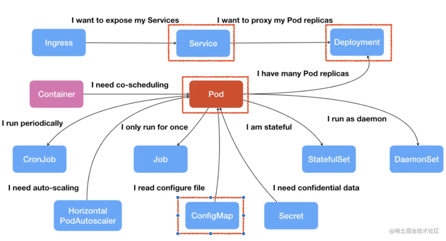 ConfigMap: K-V 结构数据,通常的用法是将 ConfigMap 挂载到 Pod ,作为配置文件提供 Pod 里新的进程使用。