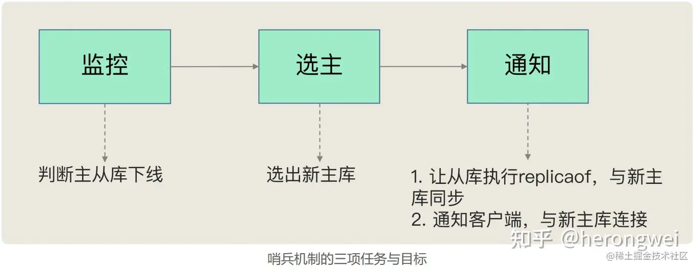 Redis 的哨兵机制自动完成了以下三大功能,从而实现了主从库的自动切换,可以降低 Redis 集群的运维开销: