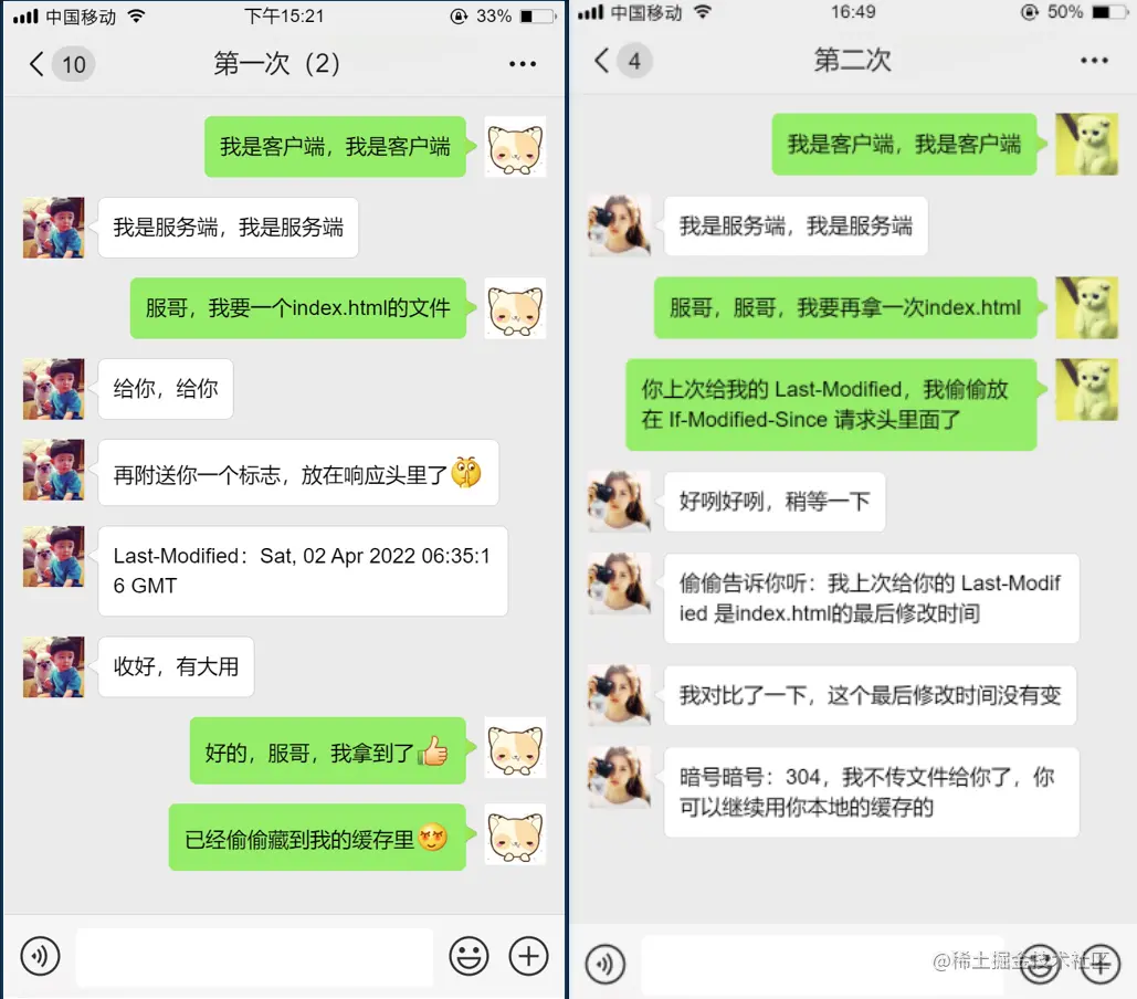 " HTTP 304 未改变说明无需再次传输请求的内容,也就是说可以使用缓存的内容。 " 用本人通俗的语言来说,304未改变,我本地已经缓存了这个文件了,然后询问服务端这个文件可以继续用本地的嘛,服务端告诉你暗号,304,304,没有改变,你可以继续用
