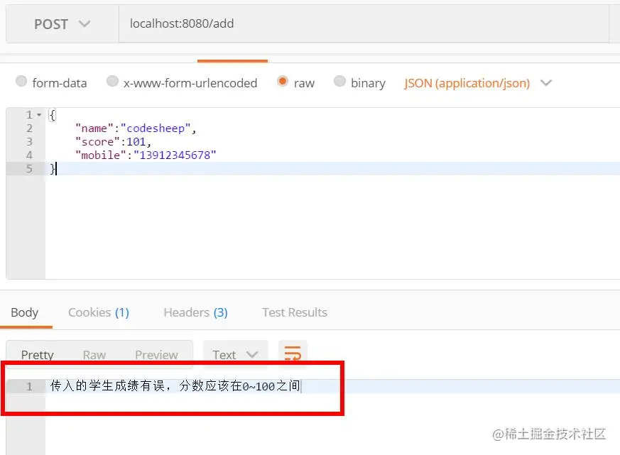 这时候,如果某个字段传入错误,比如我传数据的时候,将学生的成绩误传为 101分,则接口返回结果便会提示出错误详情: