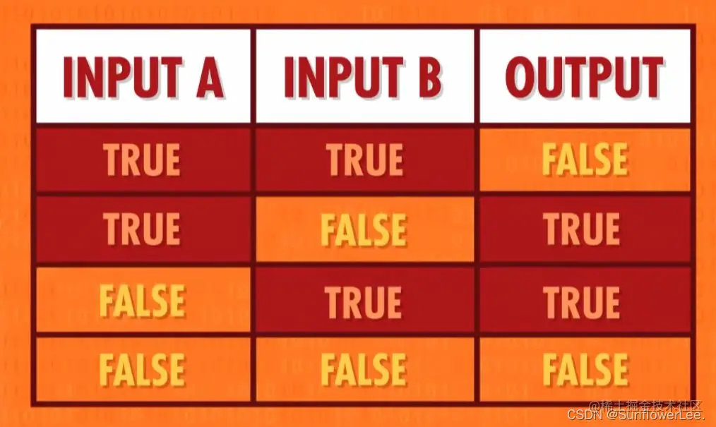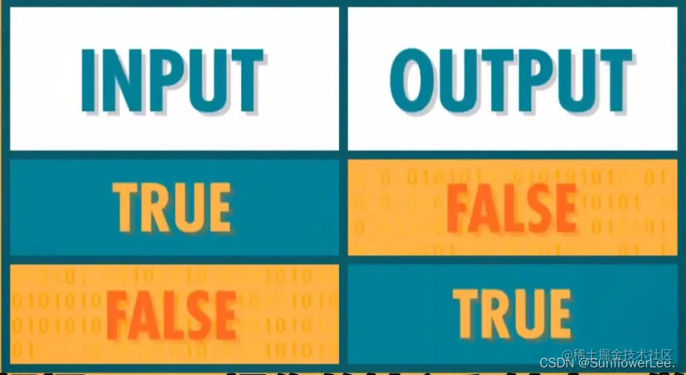 - NOT操作把布尔值反转,把true进行NOT就会变成false ,反之亦然。我们可以根据NOT操作的输入和输出,做出这个表:
