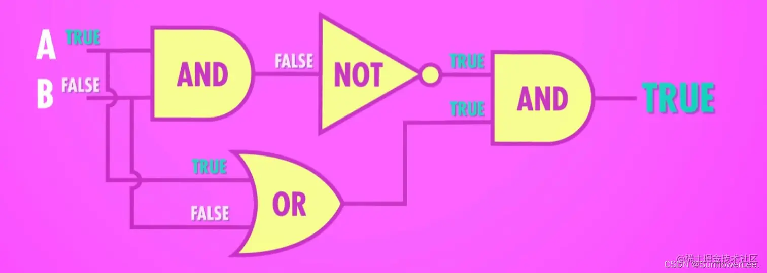 怎么用前面提到的3种门来做XOR门。我们有2个输入,A和B,还有 1个输出。我们先放一个OR门,因为OR和XOR的逻辑表很像。只有1个问题,当A和B都是true时,OR的输出和想要的XOR输出不一样,我们想要false,所以要多加几个门,如果加一个"AND门",输入是true和true,输出会是true,这不是我们想要的。但如果在AND的输出加个NOT就可以把true翻转成false了,我们最后再加一个"AND门",然后AND的2个输入,分别来自NOT和最原始的OR。AND会收到false和true,因为AND需要两个输入都为true,结果才是true。所以输出是false。XOR逻辑表的第一行对了,看接下来的几行,可以看到这个电路的确实现了XOR 。
