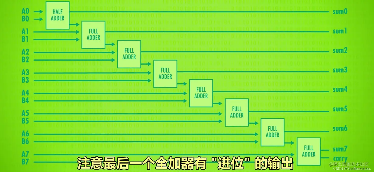 - 全加器作为独立组件,全加器会把A,B,C三个输入加起来输出"总和"和"进位"。现在有了新组件,我们可以相加两个8位数字,叫两个数字叫A和B,我们从A和B的第一位开始,叫A0和B0。因为是第一次加法,不用处理任何进位 ,所以我们可以用半加器,来加这2个数字,输出叫sum0,然后,加A1和B1,因为A0和B0的结果有可能进位,所以这次要用全加器,除了A1和B1,还要连上进位。输出叫sum1,然后,把这个全加器的进位连到下个全加器的输入,处理A2和B2,以此类推,把8个bit都搞定。