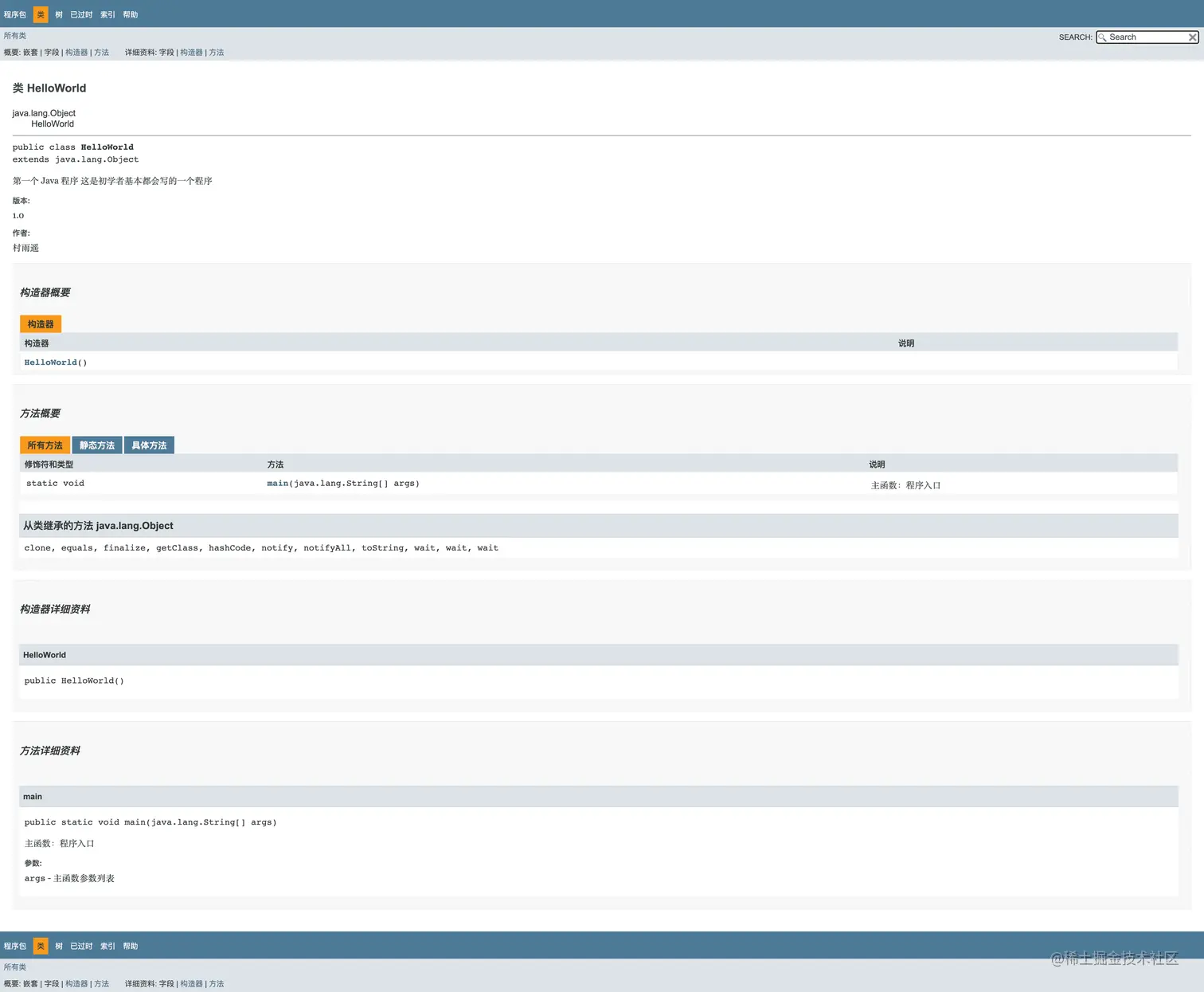 文档注释和多行注释很像,它是将我们所需要注释的内容包含在 /** 和 */ 之间。而文档注释和其他两种注释最大的区别就在于:我们可以利用 javadoc 工具来提取文档注释,然后生成一个 HTML 文档,类似于 Java 官网所提供的 API 文档,以下是一个文档注释的实例。