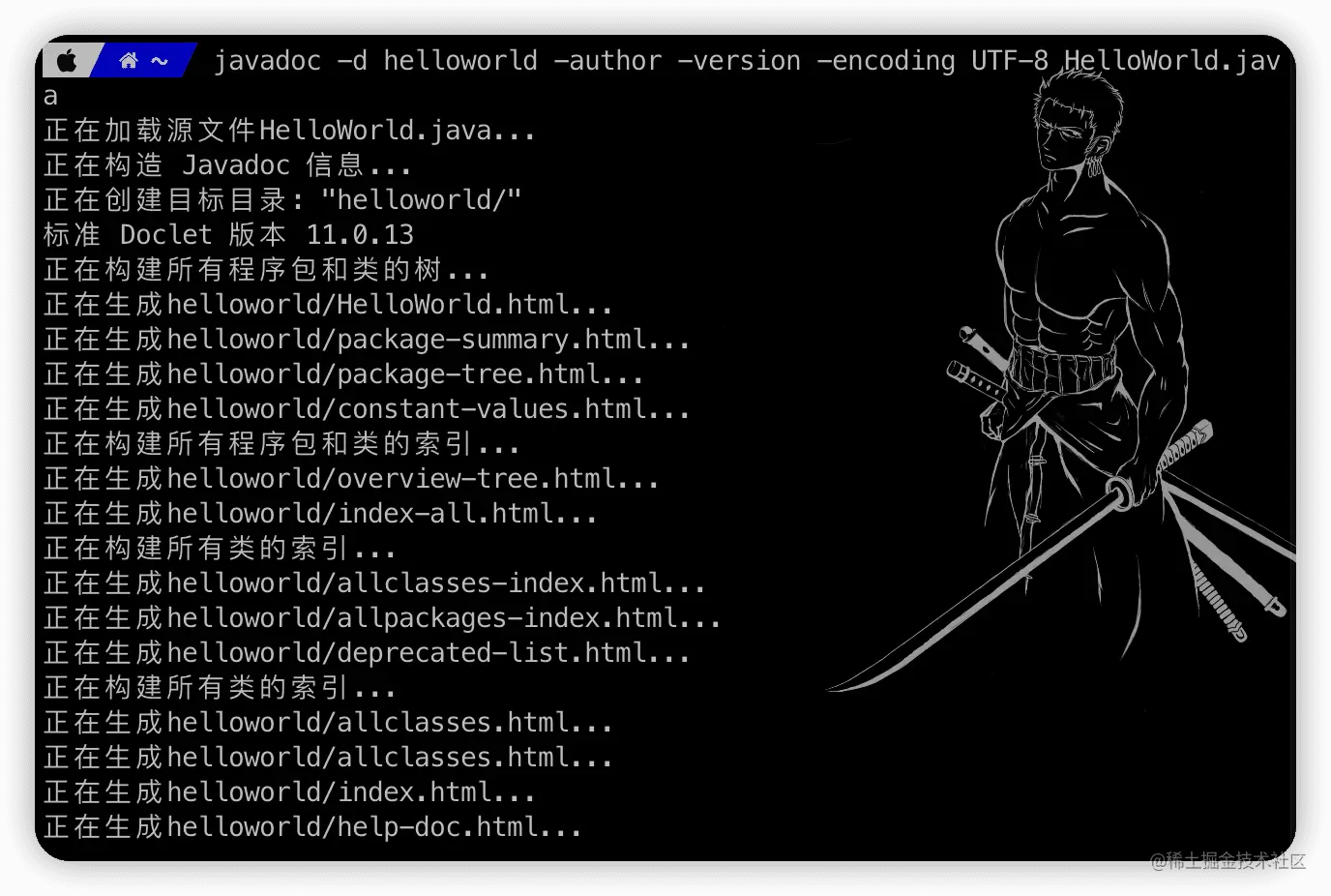 然后我们通过终端,使用 javadoc 命令就可以为上述文件生成一个 HTML 文档。